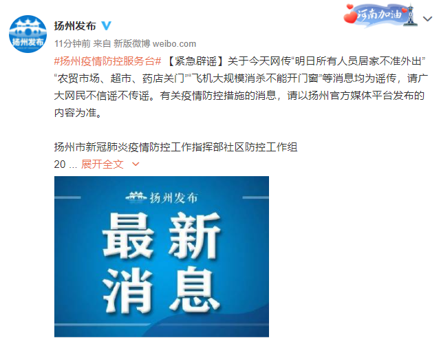 据“扬州发布”8月15日紧急发布辟谣消息,关于今天网传“明日所有人员居家不准外出”“农贸市场、超市、药店关门”“飞机大规模消杀不能开门窗”等消息均为谣传,请广大网民不信谣不传谣。有关疫情防控措施的消息,请以扬州官方媒体平台发布的内容为准。