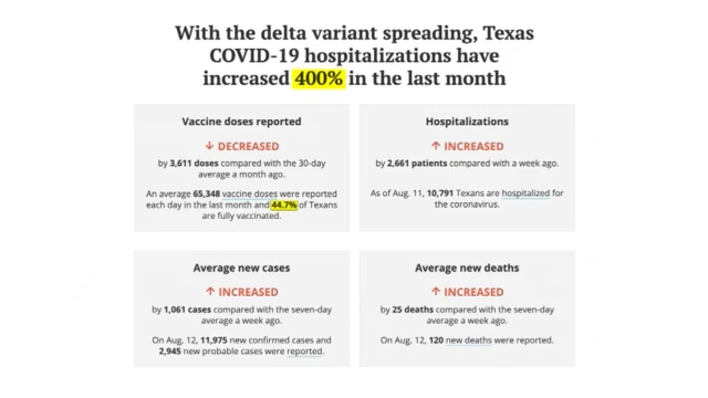 而据《得州先驱报》8月11日报道,相比一个月前,得州的新冠住院人数激增了400%,得州的整体疫苗接种比率仅为44.7%。