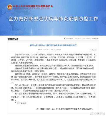 【#15日新增确诊病例51例# #15日新增本土病例13例#】据国家卫健委网站,8月15日0—24时,31个省(自治区、直辖市)和新疆生产建设兵团报告新增确诊病例51例,其中境外输入病例38例(云南11例,浙江5例,山东5例,广东5例,福建4例,北京2例,上海2例,天津1例,山西1例,辽宁1例,黑龙江1例),本土病例13例(江苏6例,河南6例,湖南1例);无新增死亡病例;无新增疑似病例。