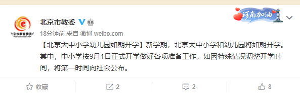 央视网消息:据北京市教委官方微博消息,新学期,北京大中小学和幼儿园将如期开学。其中,中小学按9月1日正式开学做好各项准备工作。如因特殊情况调整开学时间,将第一时间向社会公布。