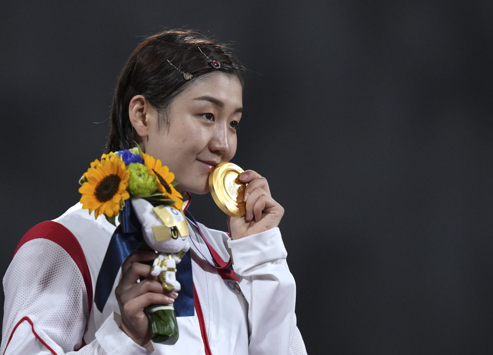 7月29日,陈梦在颁奖典礼上亲吻金牌。