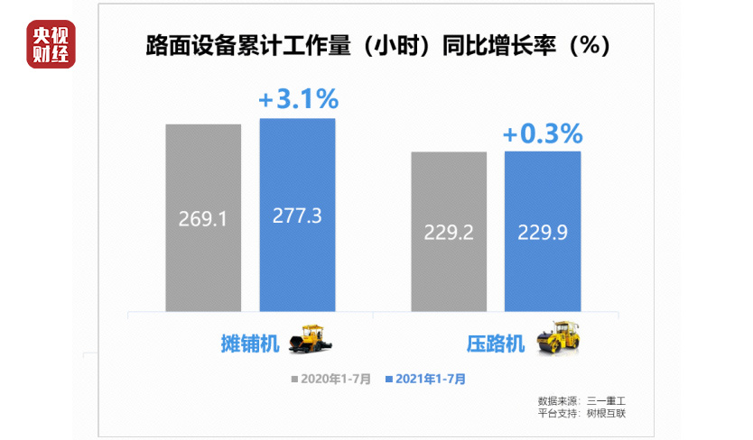 2021年1-7月,摊铺机、压路机累计工作量分别从去年同期的269.1(小时)、229.2(小时),增长至277.3(小时)、229.9(小时),增幅达3.1%、0.3%。
