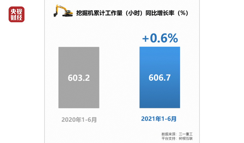 (2)2021年1-6月,挖掘机累计工作量从去年同期的603.2(小时)上升至606.7(小时),同比增长0.6%。