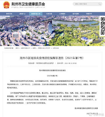 【#湖北荆州全域转为低风险地区#】15日上午,荆州市新冠肺炎疫情防控指挥部发布通告称,根据新冠肺炎疫情防控有关规定,经专家组综合研判,荆州市新冠肺炎疫情防控指挥部决定自8月15日12时起,将荆州市沙市区塔桥路以东、江津中路以北、工农路以西、太岳东路以南围合区解除封闭管理,并调整为低风险区。调整后,荆州市全域为低风险区。(记者熊琦)