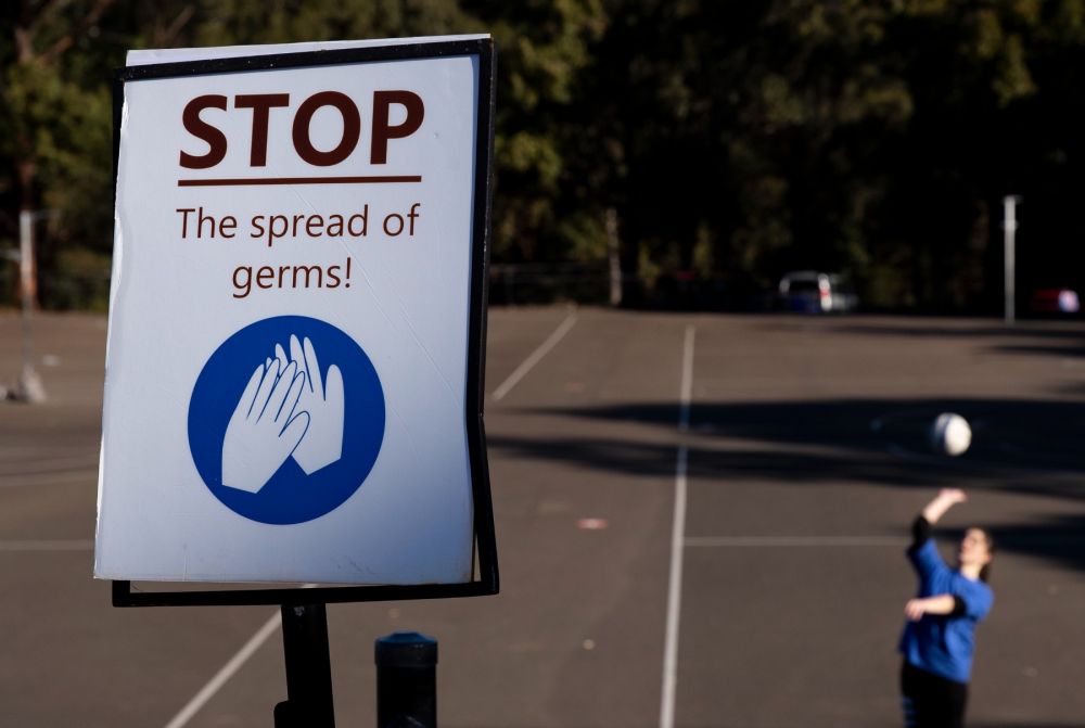 8月4日,在澳大利亚悉尼一处运动场边拍摄的防疫提示。(新华社记者白雪飞摄)