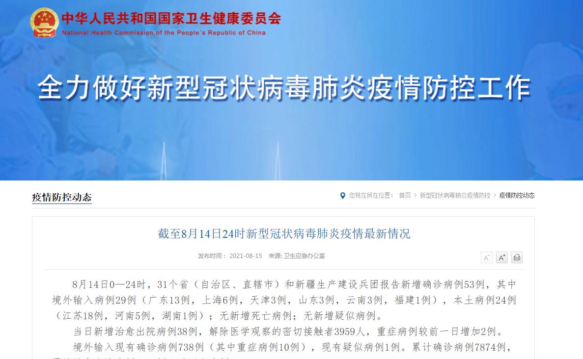 央视网消息:据国家卫健委网站消息,8月14日0—24时,31个省(自治区、直辖市)和新疆生产建设兵团报告新增确诊病例53例,其中境外输入病例29例(广东13例,上海6例,天津3例,山东3例,云南3例,福建1例),本土病例24例(江苏18例,河南5例,湖南1例);无新增死亡病例;无新增疑似病例。