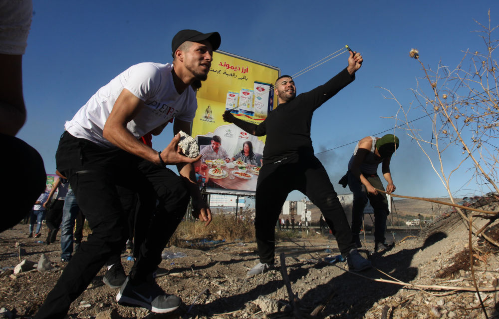 5月15日,巴勒斯坦人在约旦河西岸城市纳布卢斯附近向以色列士兵投掷石块。(新华社发)