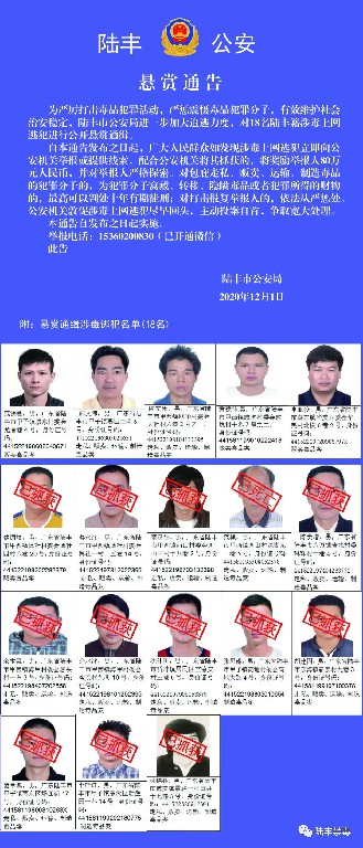 为严厉打击毒品犯罪行为,坚决惩处毒品犯罪分子,广东省陆丰市公安局进一步加大追逃力度。现对剩余5名未落网的陆丰籍涉毒上网逃犯继续公开悬赏通缉,广大人民群众如发现涉毒上网逃犯请立即向公安机关举报或提供线索,配合公安机关将其抓获的,奖励举报人80万元。