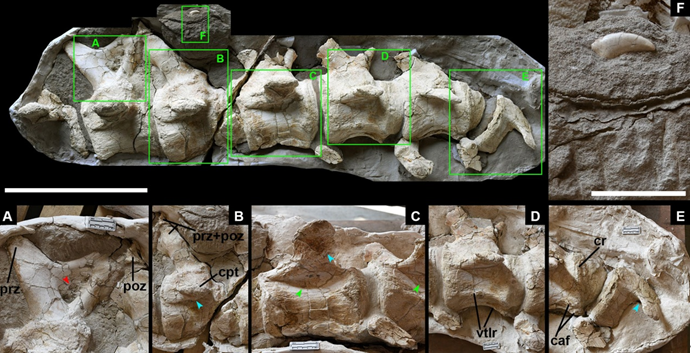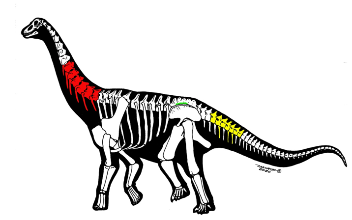 △三件恐龙化石骨骼保存示意图(Maurilio Oliveira绘)红色(颈椎):中国丝路巨龙;黄色(尾椎):新疆哈密巨龙;绿色(荐椎):未命名化石