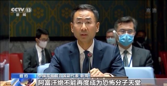 中国常驻联合国副代表 耿爽:阿富汗绝不能再度成为恐怖分子天堂,这是阿富汗未来任何政治解决方案必须坚守的底线。希望阿富汗塔利班切实履行承诺,彻底切断同一切恐怖组织的联系。各国应根据国际法和安理会决议履行义务合作打击一切恐怖主义,坚决防止“伊斯兰国” 、“基地”组织、“东伊运”等恐怖组织趁乱坐大。