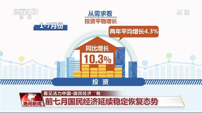 从生产看,工业持续增长,1—7月份规模以上工业增加值同比增长14.4%,两年平均增长6.7%。服务业不断发展,1—7月份服务业生产指数同比增长19.6%,两年平均增长6.5%。再看需求,投资平稳增长,1—7月份投资同比增长10.3%,两年平均增长4.3%。市场销售保持增长,1—7月份社会消费品零售总额同比增长20.7%,两年平均增长4.3%。就业保持稳定,1—7月份全国城镇新增就业达到822万人,全国调查失业率平均为5.2%,低于宏观调控预期目标。