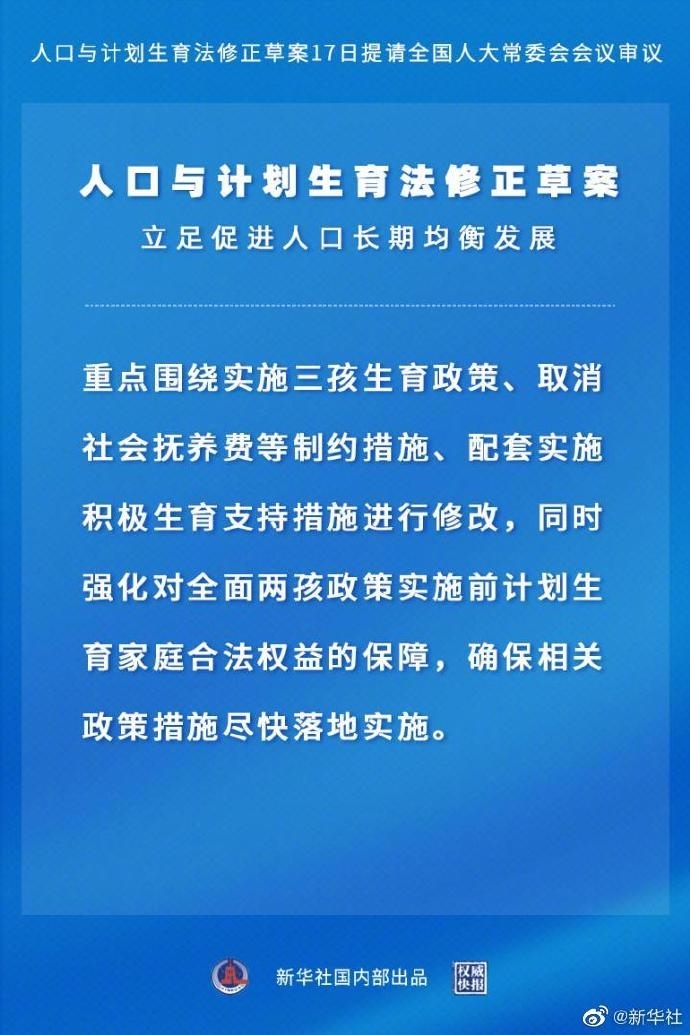 【#权威快报#|#人口计生法修改拟明确实施三孩生育政策及配套支持措施#】17日,人口与计划生育法修正草案提请十三届全国人大常委会第三十次会议审议。修正草案立足促进人口长期均衡发展,重点围绕实施三孩生育政策、取消社会抚养费等制约措施、配套实施积极生育支持措施进行修改,同时强化对全面两孩政策实施前计划生育家庭合法权益的保障,确保相关政策措施尽快落地实施。(记者田晓航,海报设计张晨光)