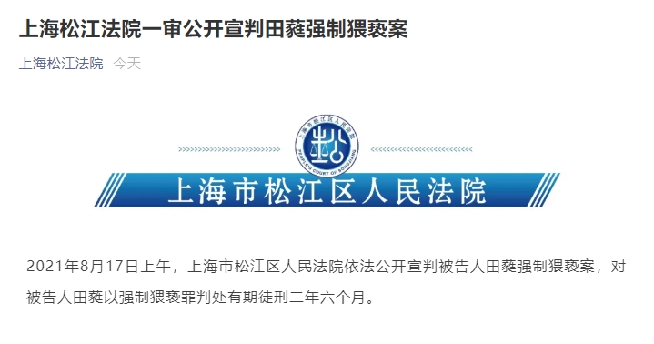 据上海松江法院微信公众号消息,2021年8月17日上午,上海市松江区人民法院依法公开宣判被告人田蕤强制猥亵案,对被告人田蕤以强制猥亵罪判处有期徒刑二年六个月。
