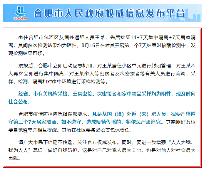 根据合肥市政府17日发布通告,家住合肥市包河区从国外返肥人员王某,先后接受14+7天集中隔离+7天居家隔离,其间多次检测结果均为阴性,8月16日在对其开展第二个7天结束时核酸检测中,发现检测结果可疑,后经复检确认为无症状感染者。