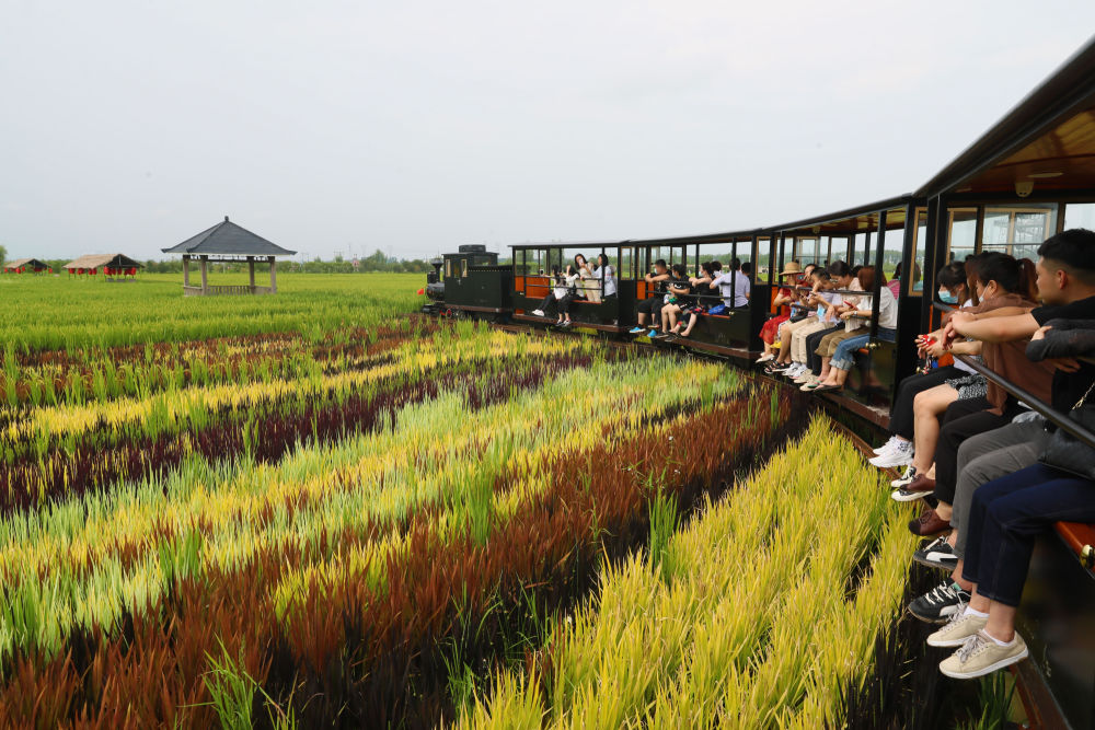 ↑8月16日,游客乘坐小火车在稻田中观光游览。