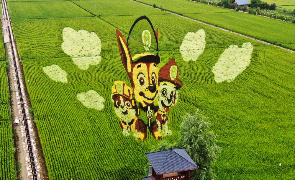 ↑这是8月16日拍摄的稻田画《小狗汪汪队》(无人机照片)。