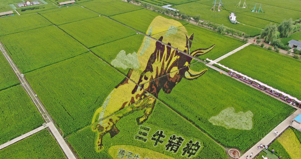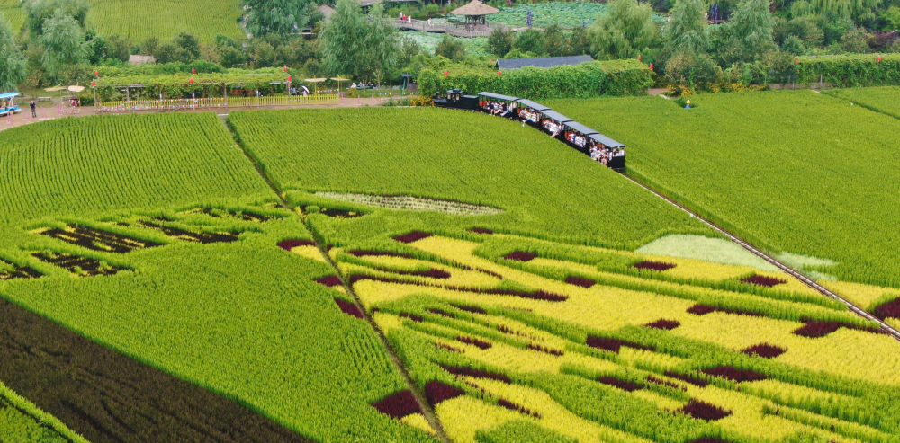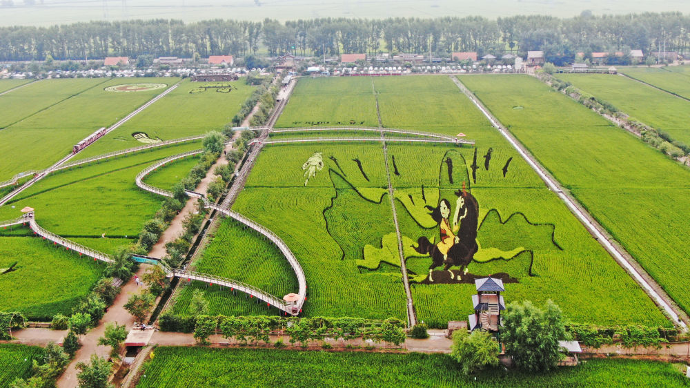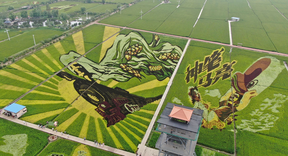 近日,辽宁省沈阳市沈北新区锡伯龙地创意农业产业园的稻田画进入观赏期,多种色彩的水稻组成稻田画,吸引众多游人前来观光体验。