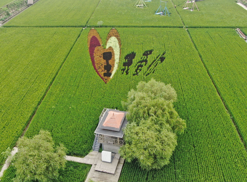 ↑这是8月16日拍摄的稻田画《我爱你》(无人机照片)。