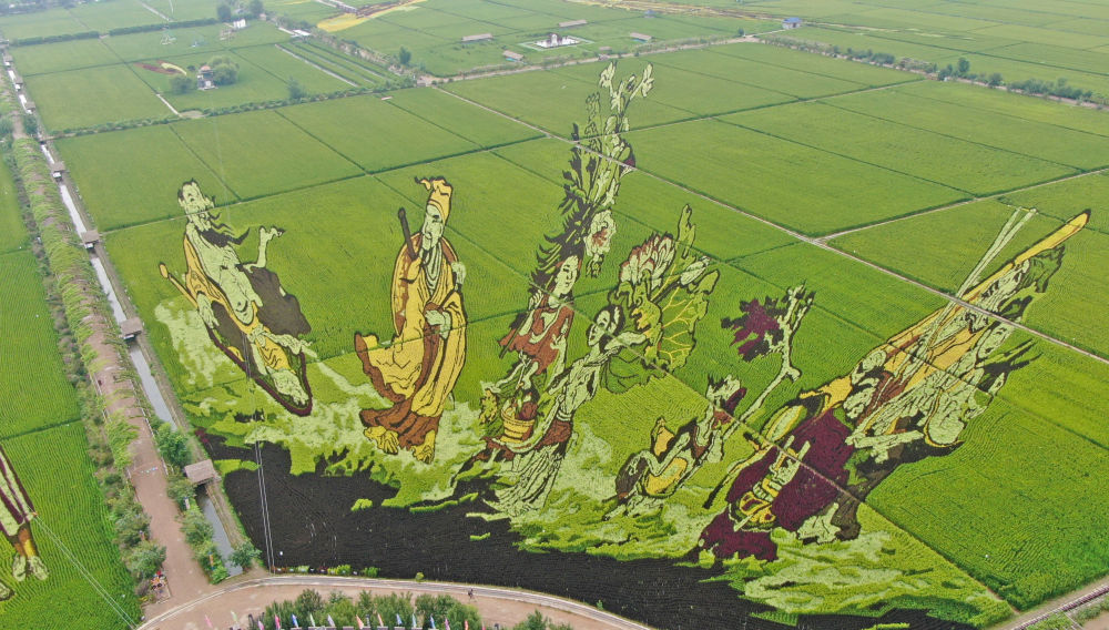 ↑这是8月16日拍摄的稻田画《八仙过海》(无人机照片)。