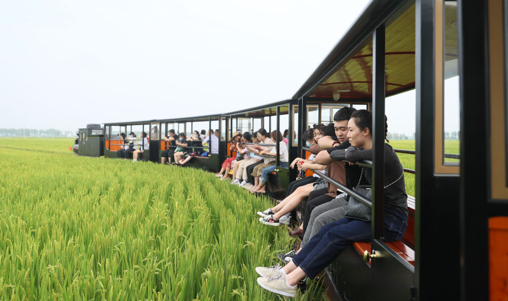 ↑8月16日,游客乘坐小火车在稻田间观光游览。
