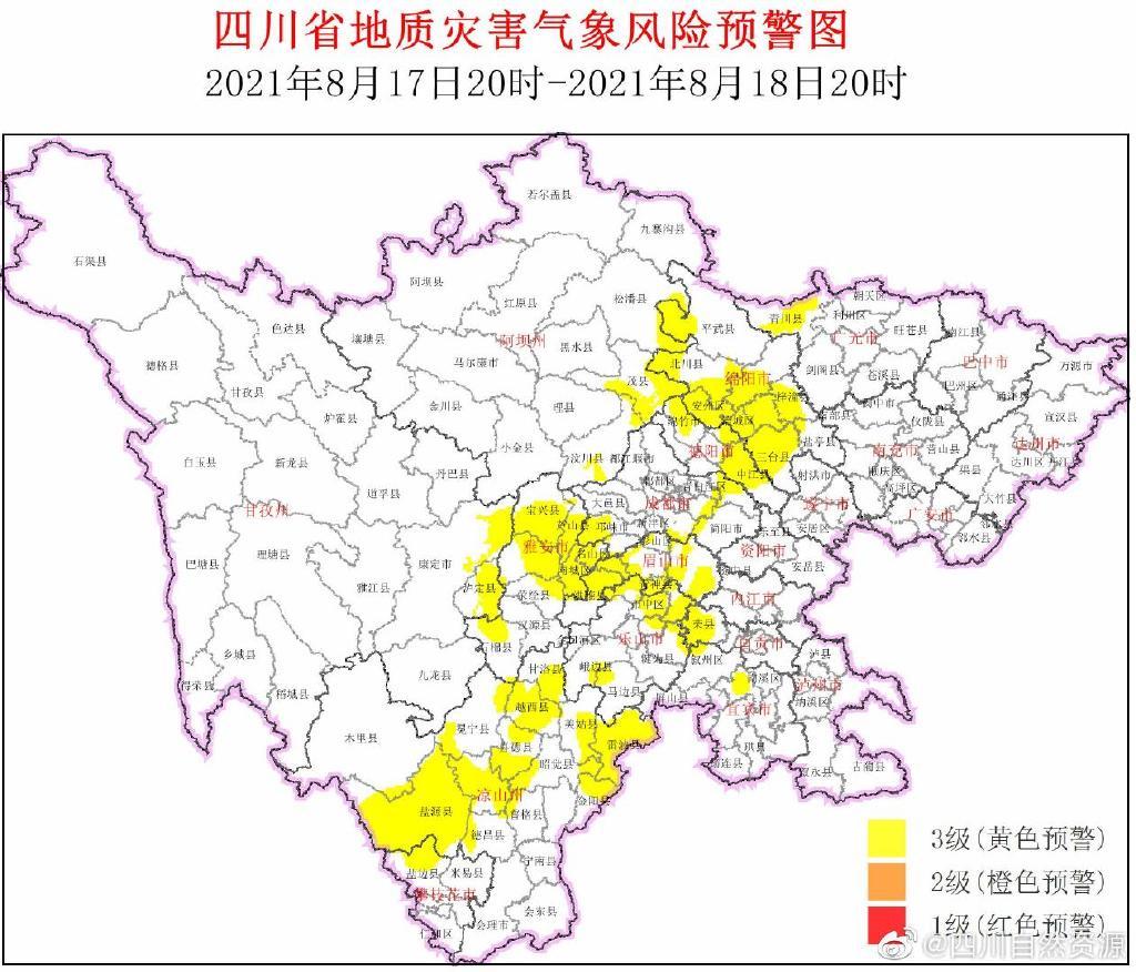 【四川连发双预警,这些区域要注意了!】结合四川省气象台天气预报情况,8月17日20:00~8月18日20:00,四川省地质灾害气象风险预警结果如下: