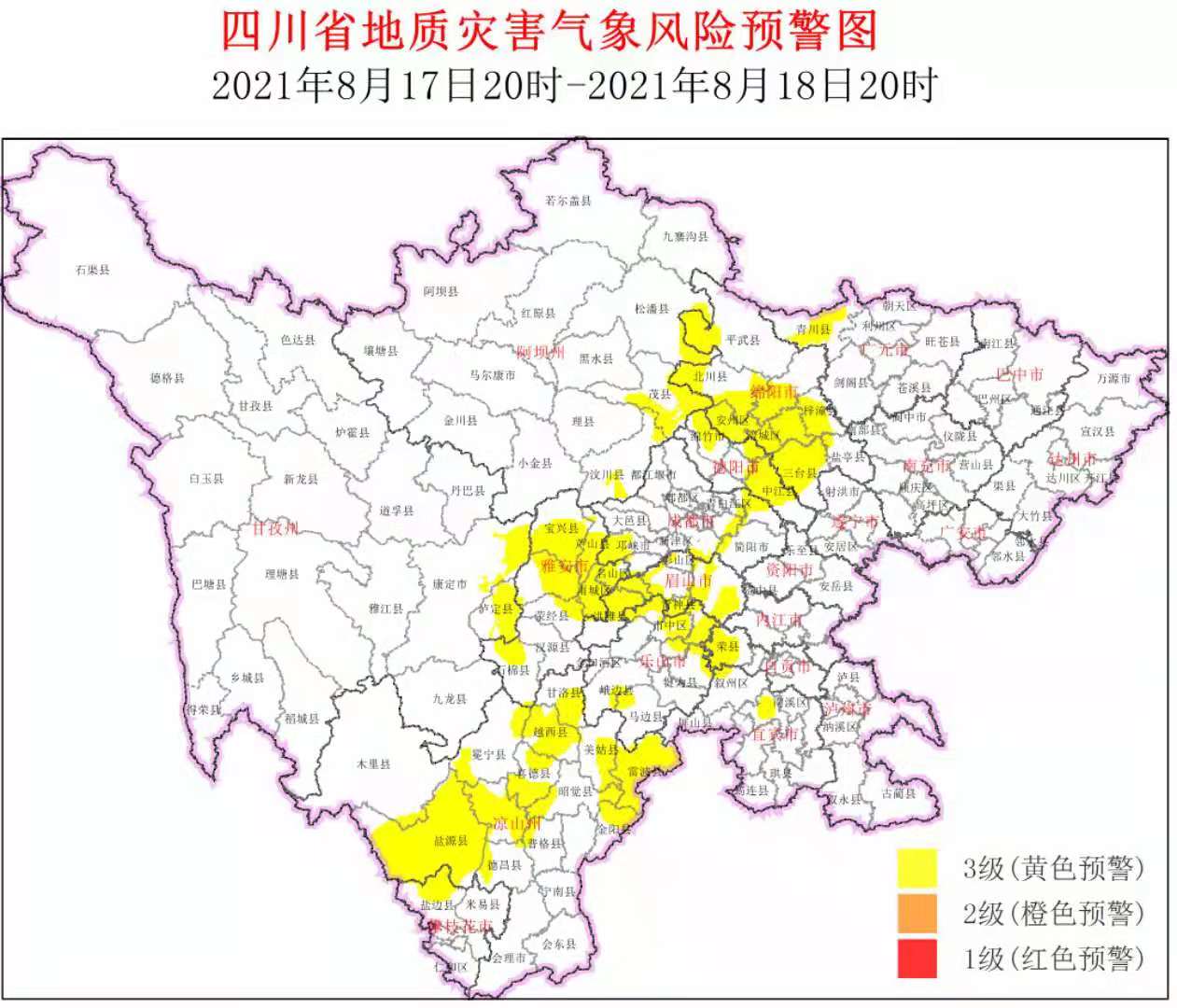 黄色预警区域为广元青川县,绵阳安州区、涪城区、游仙区、江油市、盐亭县、平武县、三台县、梓潼县、北川县,德阳旌阳区、罗江区、广汉市、绵竹市、中江县,成都龙泉驿区、青白江区、双流区、邛崃市、简阳市、金堂县、蒲江县,自贡荣县,宜宾叙州区、翠屏区,雅安名山区、雨城区、荥经县、汉源县、石棉县、天全县、芦山县、宝兴县,眉山东坡区、彭山区、青神县、仁寿县、洪雅县、丹棱县,乐山市中区、五通桥区、峨眉山市、峨边县、马边县、犍为县、井研县、夹江县,攀枝花盐边县,阿坝州汶川县、理县、茂县、松潘县,甘孜州康定市、泸定县,凉山州西昌市、木里县、盐源县、德昌县、普格县、金阳县、昭觉县、喜德县、冕宁县、越西县、甘洛县、美姑县、雷波县等13市(州)67个县(市、区)。