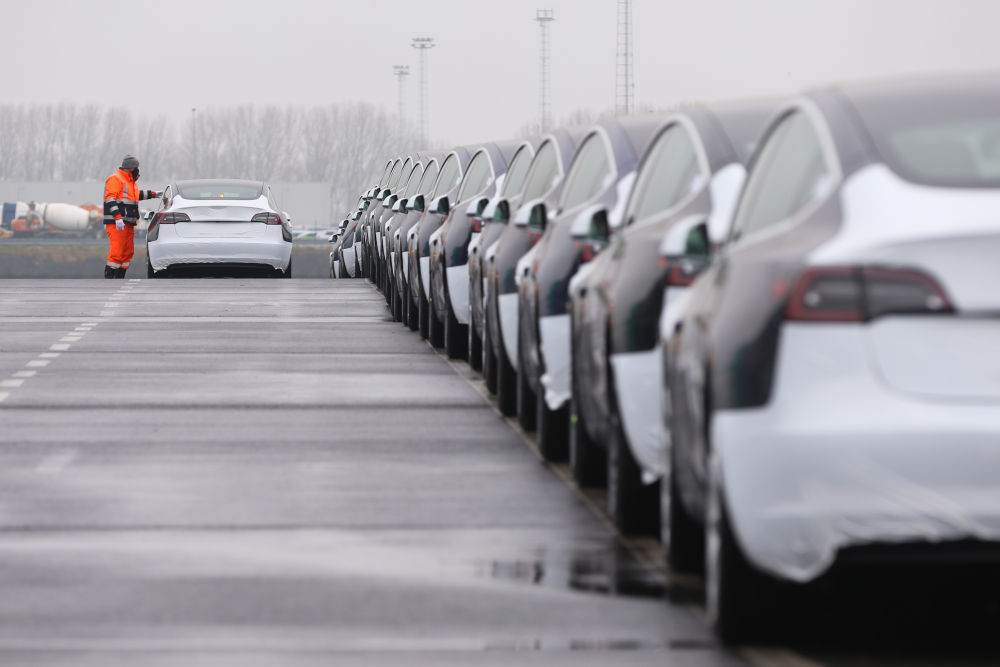 2020年11月27日,工作人员在比利时泽布吕赫港对特斯拉Model 3汽车进行装卸作业。(新华社记者郑焕松摄)