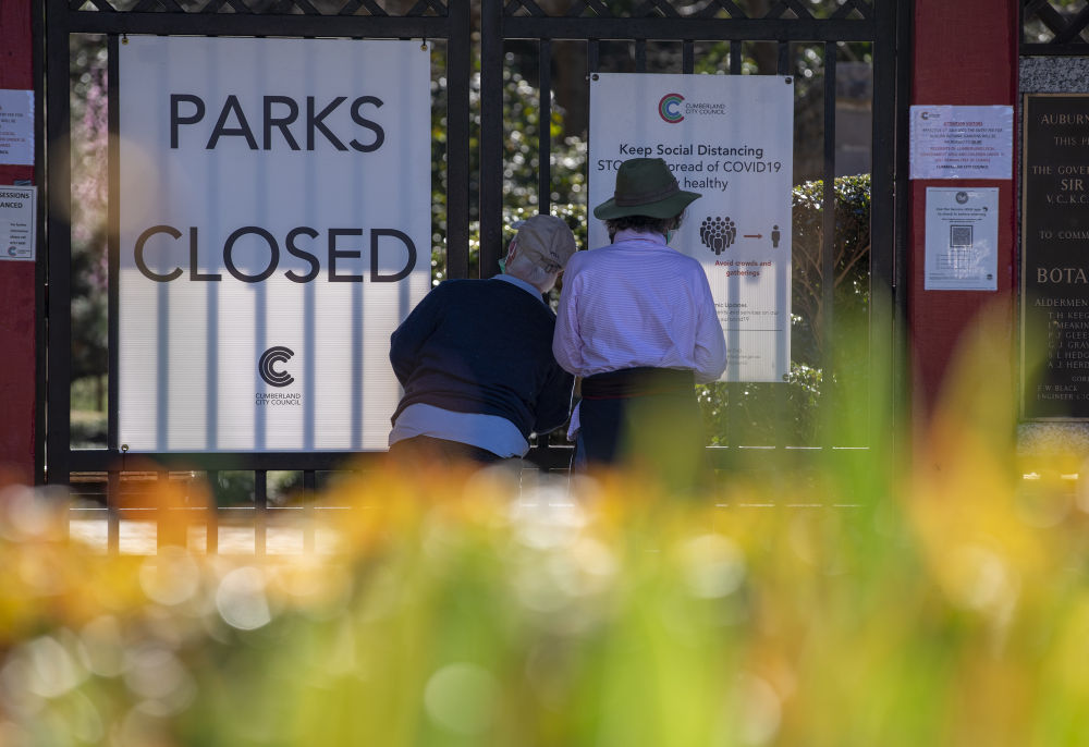 8月16日,澳大利亚悉尼的两名市民站在一个关闭的公园门外。(新华社记者白雪飞摄)