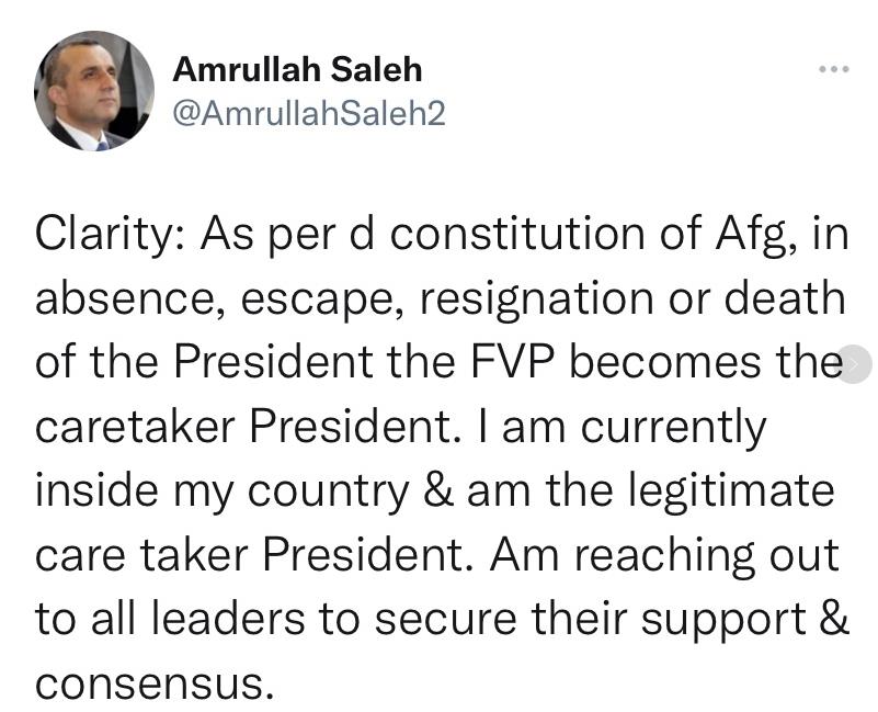 当地时间17日,阿富汗政府第一副总统萨利赫通过社交媒体账号宣布,根据阿富汗宪法,在总统缺席,逃跑,辞职和死亡的情况下,第一副总统将成为看守总统。他尚在国内,应合法接任该职位。他正在寻求其他领导人的支持和共识。(总台记者 席猛)