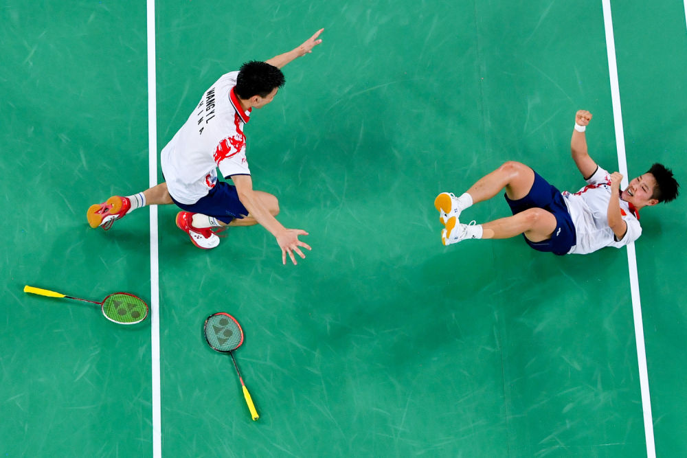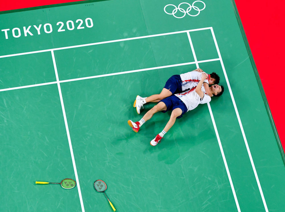 ↑7月30日,中国队组合王懿律(右)/黄东萍在夺得东京奥运会羽毛球混合双打冠军后倒地庆祝。