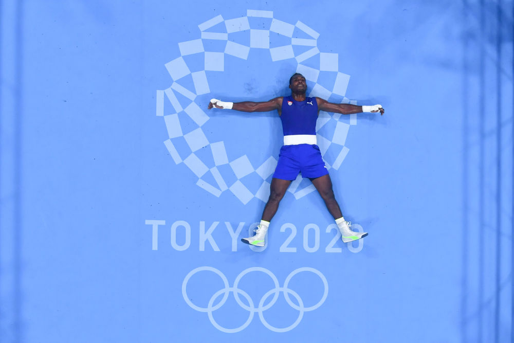 ↑8月6日,古巴队选手拉克鲁斯在夺得东京奥运会拳击男子重量级冠军后倒地庆祝。