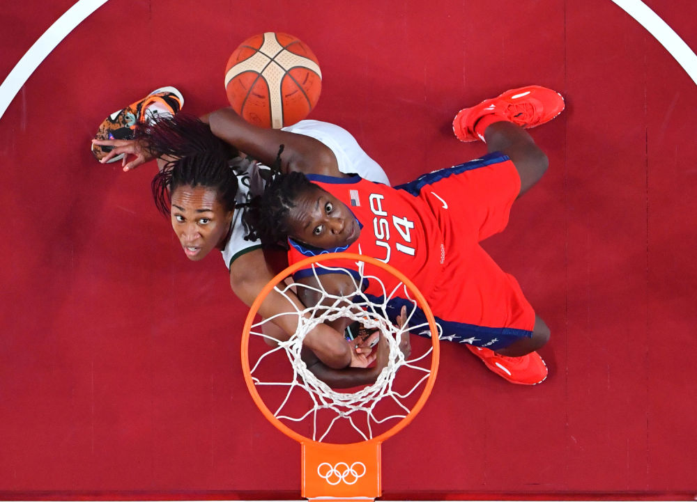 ↑7月27日,美国队球员蒂娜·查尔斯(右)在东京奥运会女子篮球B组美国对阵尼日利亚的小组赛中拼抢。