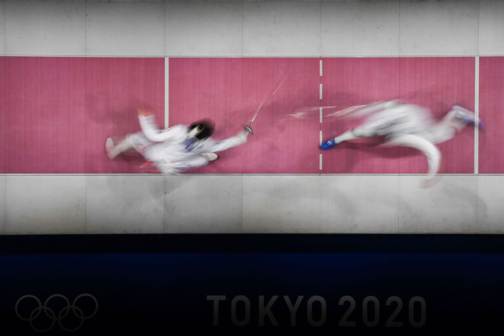 ↑7月30日,中国队选手兰明豪(右)在东京奥运会击剑男子团体重剑铜牌赛中。
