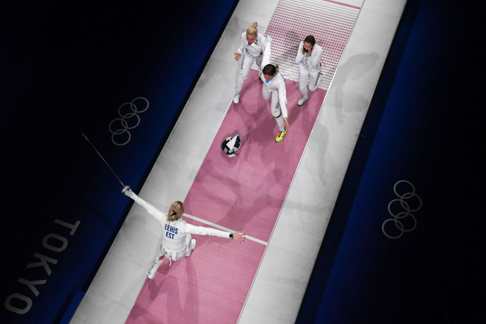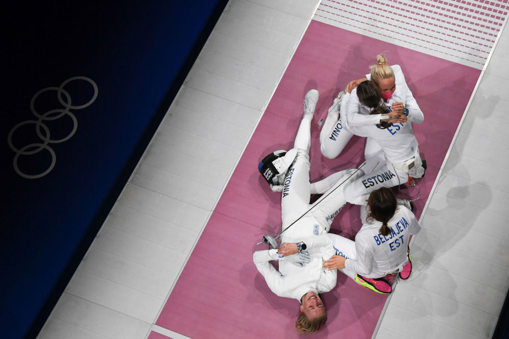 ↑7月27日,爱沙尼亚队选手莱希斯(下)在夺得东京奥运会女子重剑团体金牌后与队友庆祝。