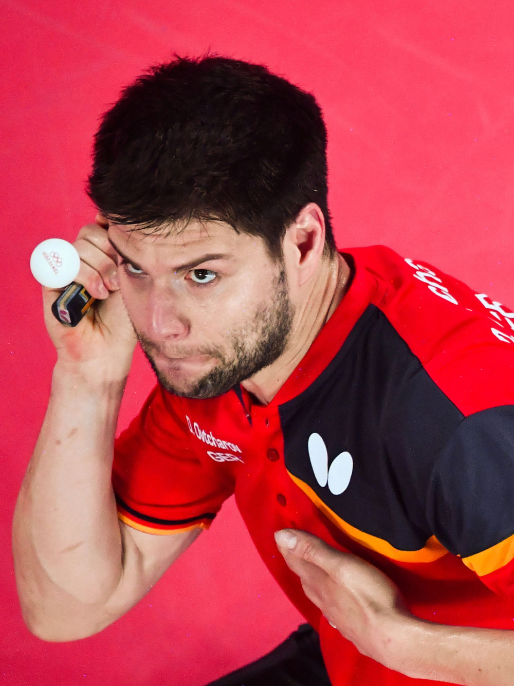 ↑7月30日,德国队选手奥恰洛夫在东京奥运会男子单打铜牌赛中发球。