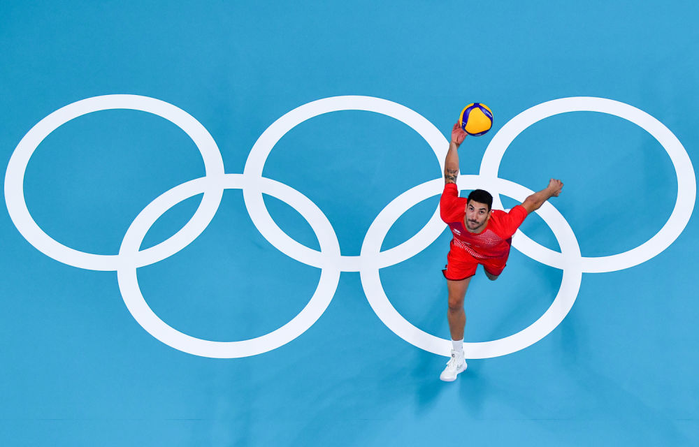 ↑7月28日,法国队选手勒戈夫在东京奥运会男子排球法国对阵阿根廷的小组赛中发球。