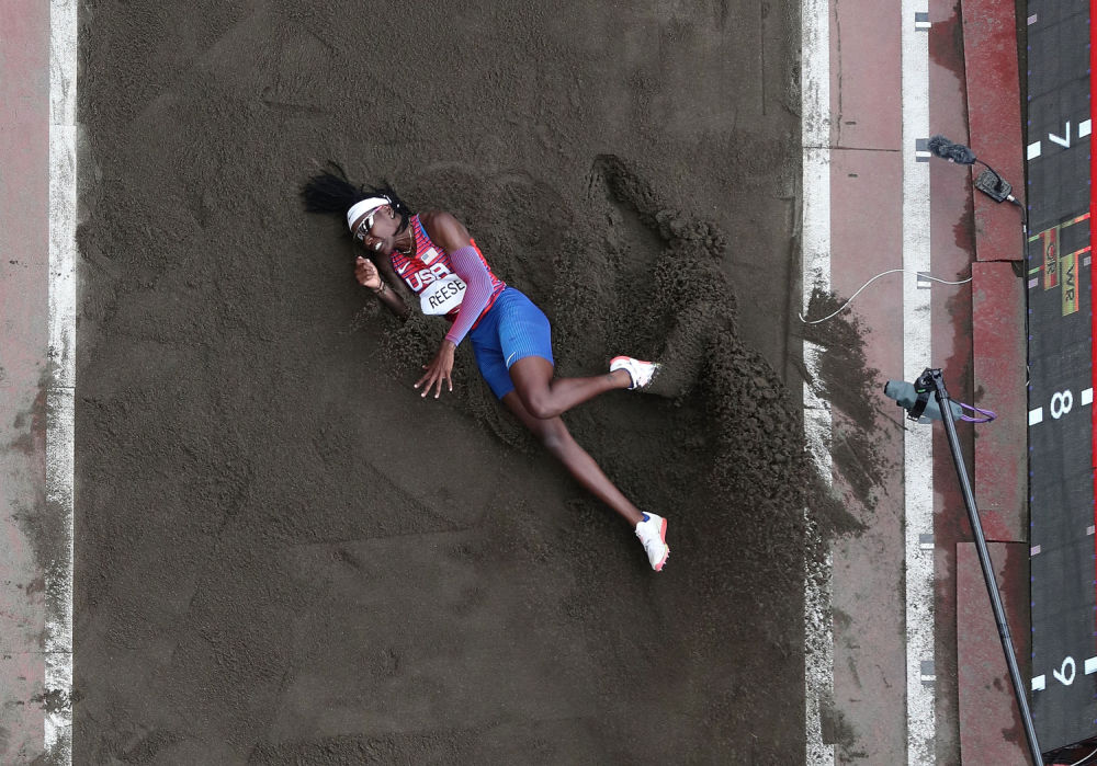 ↑8月3日,美国选手布里特妮·里斯在东京奥运会女子跳远决赛中。