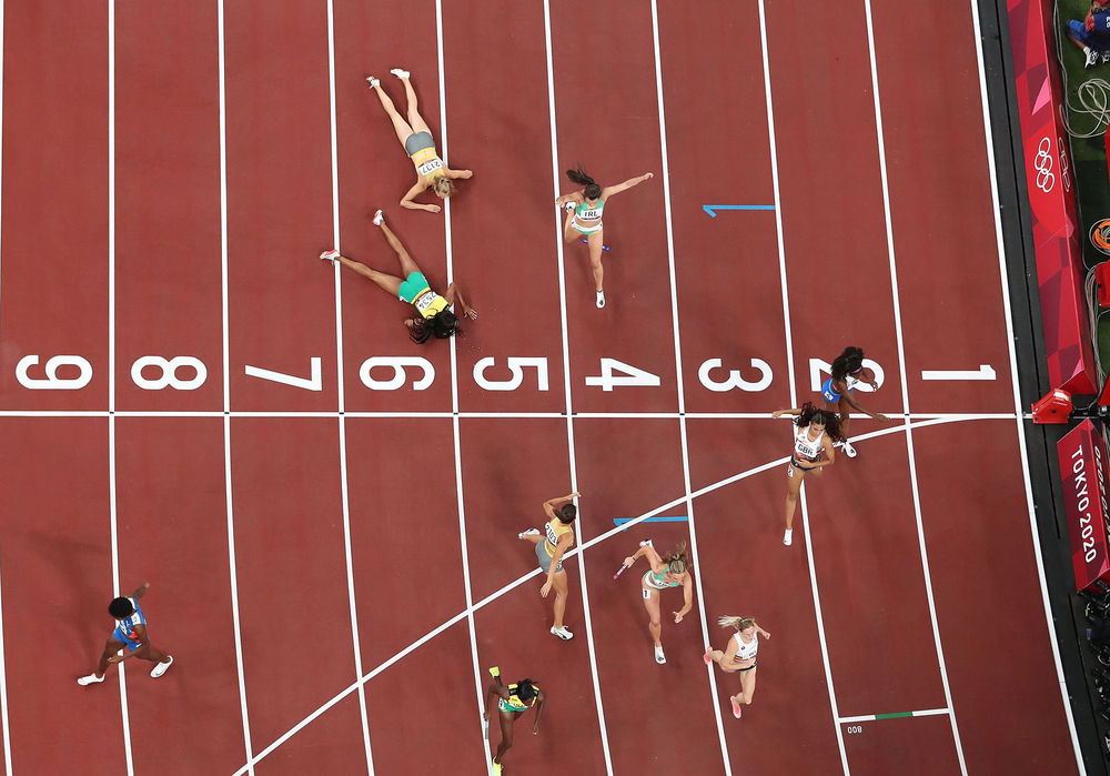 ↑7月31日,牙买加和德国选手在东京奥运会4x400米混合接力决赛中摔倒。