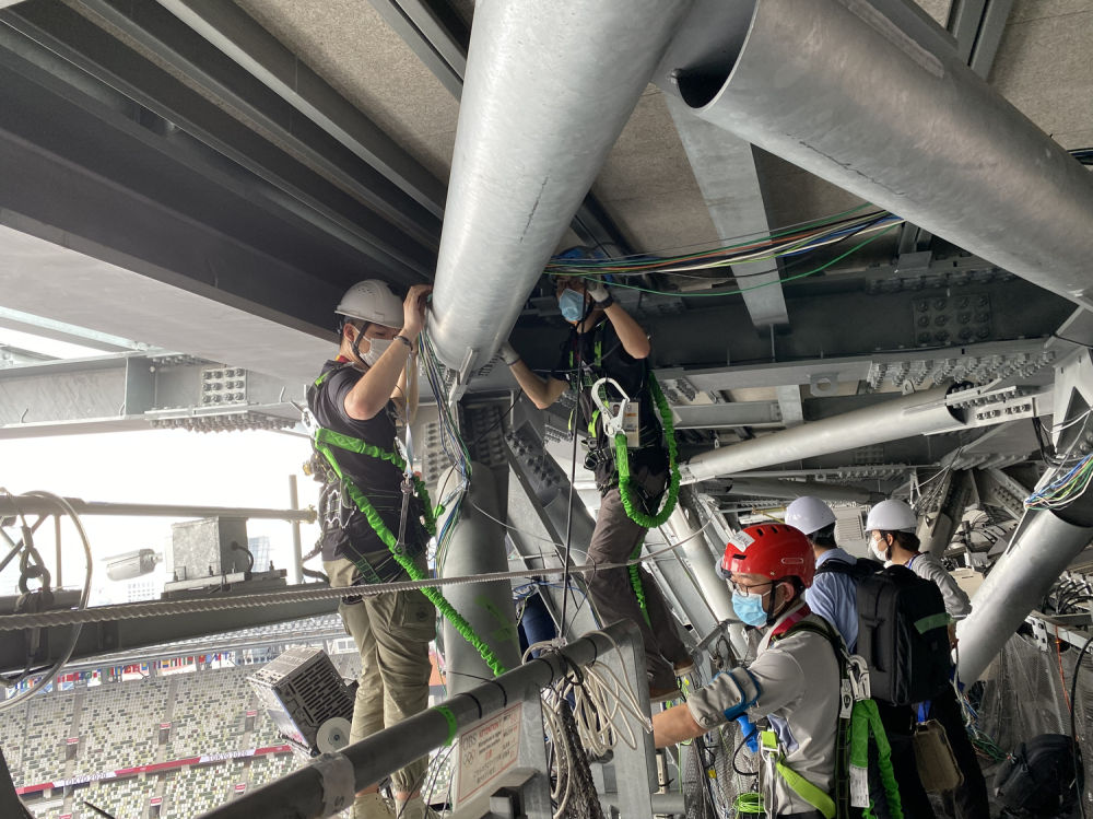 ↑徐子鉴(上右)、陈益宸(上左)、孔佳泉(下)在东京新国立竞技场为固定遥控相机布置线缆。