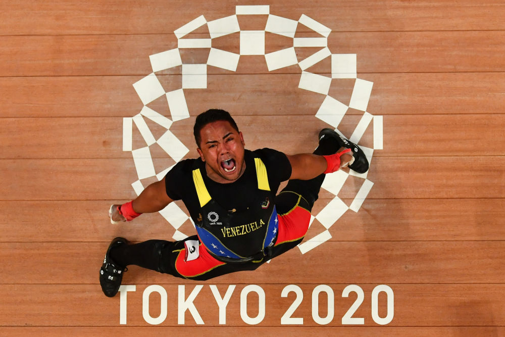 ↑7月31日,委内瑞拉队选手桑切斯在东京奥运会举重男子96公斤级比赛中庆祝。