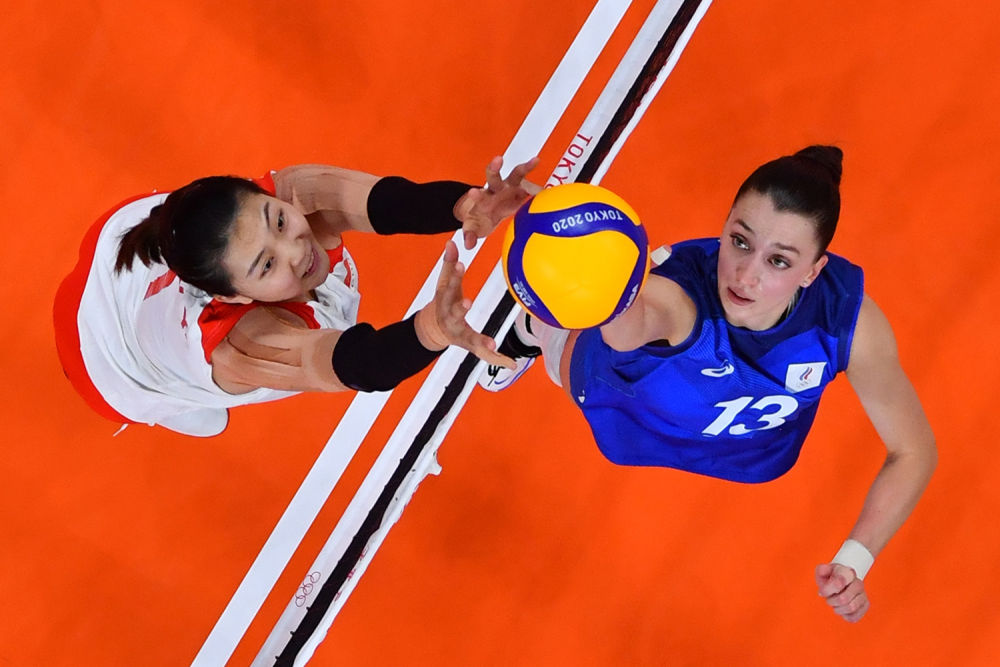 ↑7月29日,中国队选手袁心玥(左)在东京奥运会女子排球中国对阵俄罗斯运动员队的小组赛中拦网。