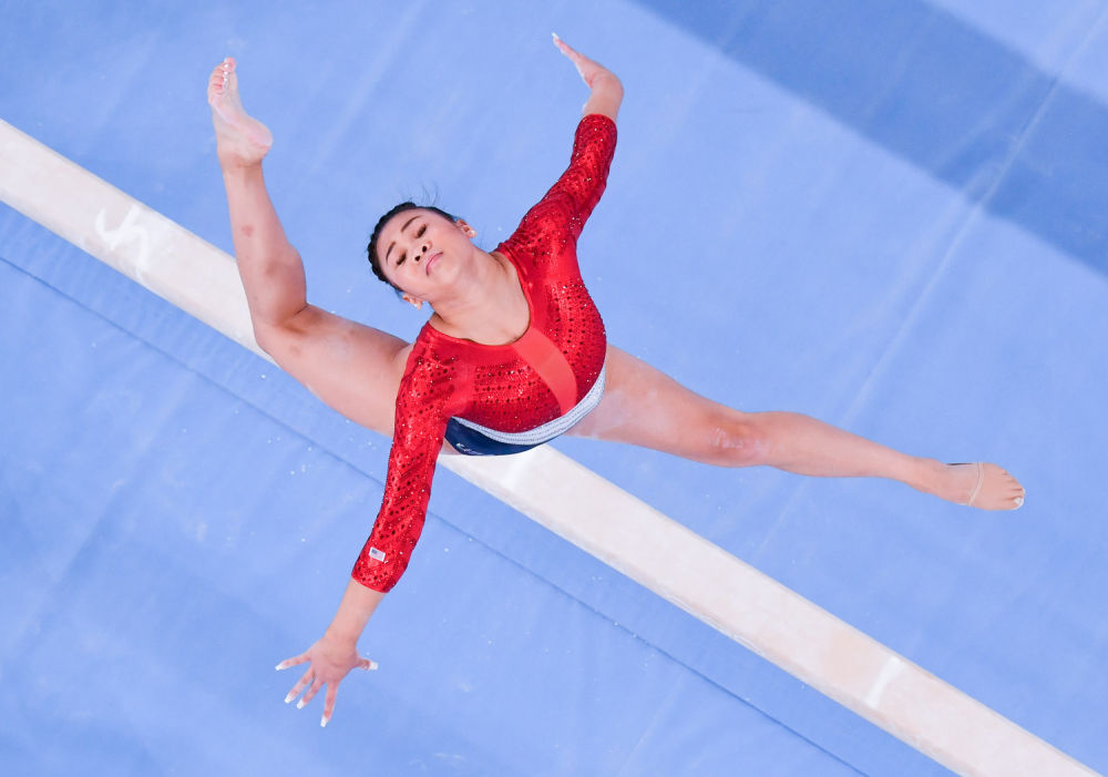↑7月27日,美国选手苏妮莎·李在东京奥运会体操女子团体决赛平衡木比赛中。