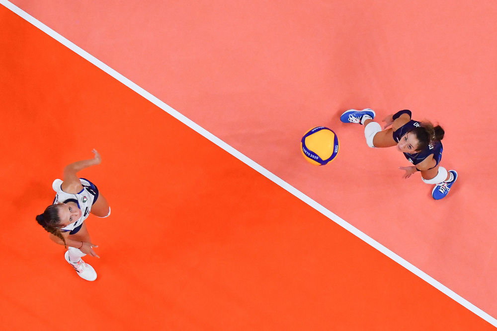 ↑7月27日,意大利队运动员真纳罗(右)与马利诺夫在东京奥运会女子排球意大利对阵土耳其的小组赛上。