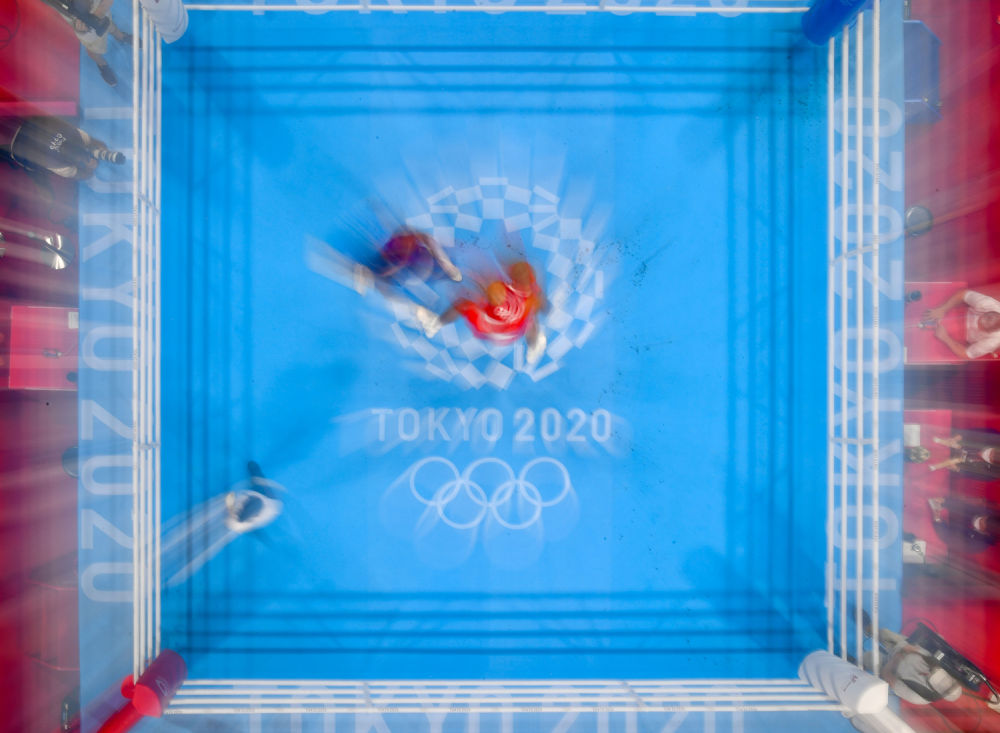 ↑8月4日,古巴队选手洛佩斯(蓝)与英国队选手惠特克在东京奥运会拳击男子轻量级决赛中。