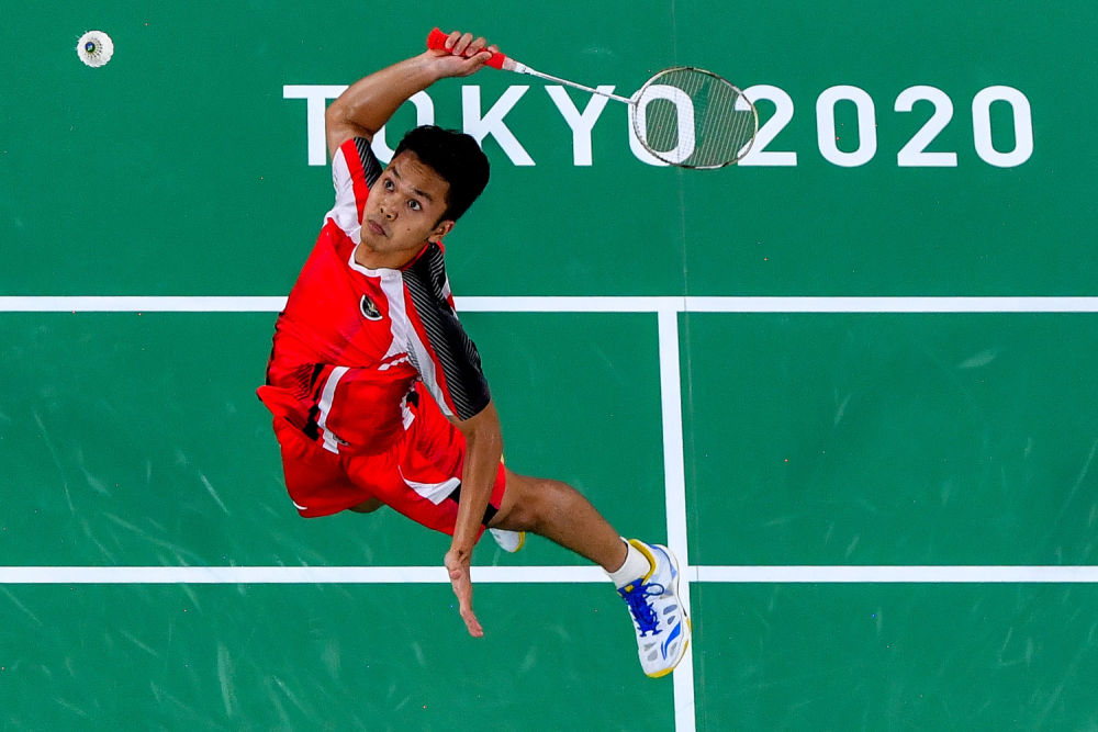↑8月2日,印度尼西亚队选手金廷在东京奥运会羽毛球男子单打铜牌赛中回球。