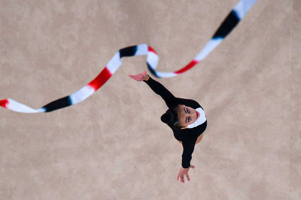 ↑8月6日,阿塞拜疆队选手阿哈米罗娃在东京奥运会艺术体操比赛中。