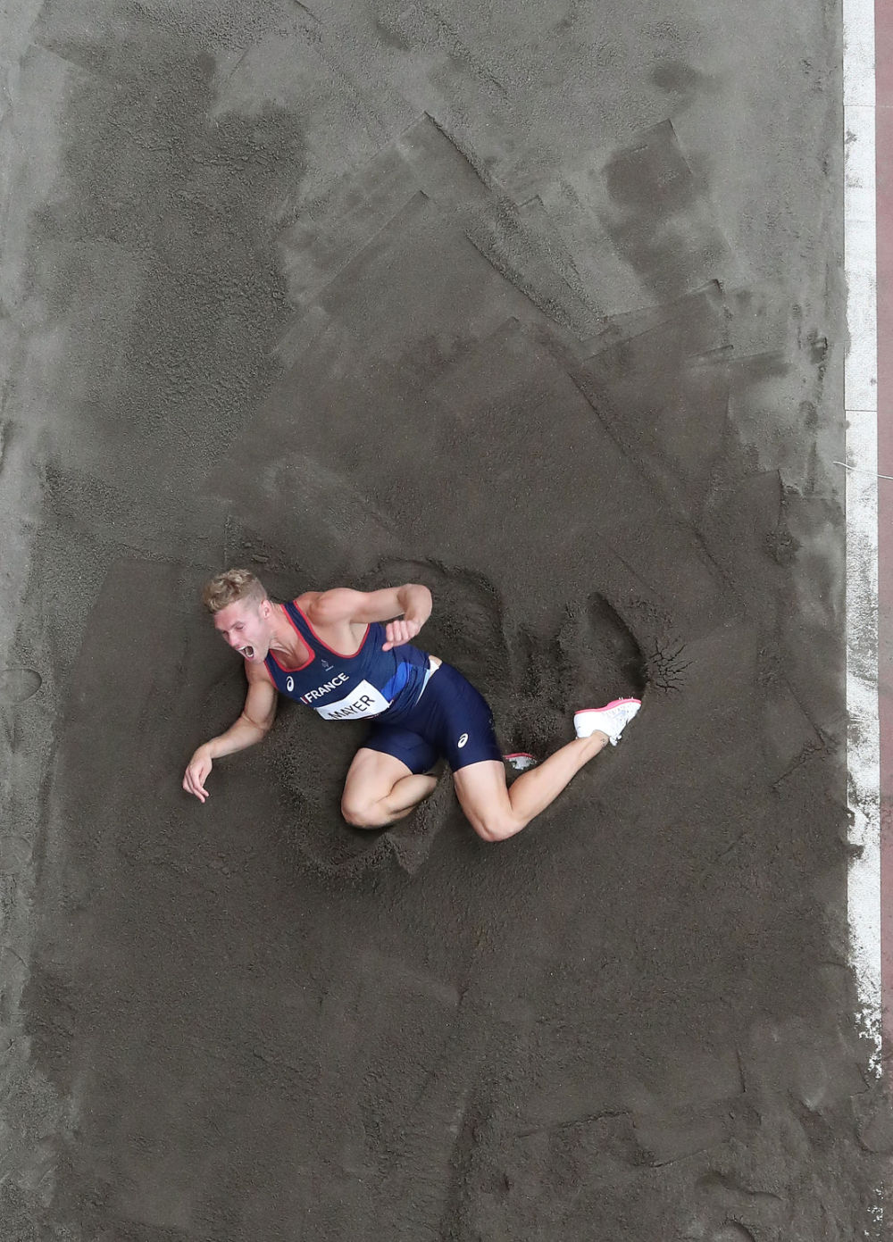 ↑8月4日,法国队选手马耶尔在东京奥运会男子十项全能跳远比赛中。