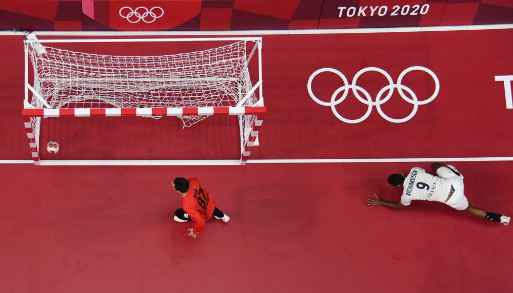 ↑7月24日,法国队球员里夏尔松(右)在东京奥运会男子手球法国对阵阿根廷的小组赛中射门得分。