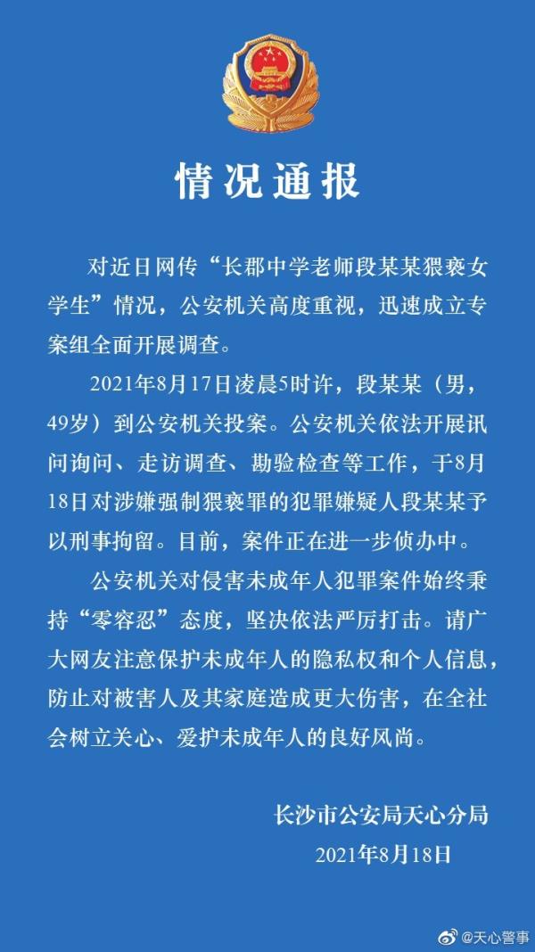 央视网消息:据@长沙警事消息,对近日网传“长郡中学老师段某某猥亵女学生”情况,公安机关高度重视,迅速成立专案组全面开展调查。