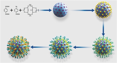 “团队利用金纳米粒子对有机金属骨架进行原位杂化。”毛峥伟解释道,就是将氯金酸溶液加入有机金属骨架中,通过一系列化学反应让有机金属骨架表面生长金纳米粒子,整体外形像表面嵌了很多葡萄干的球形蛋糕。